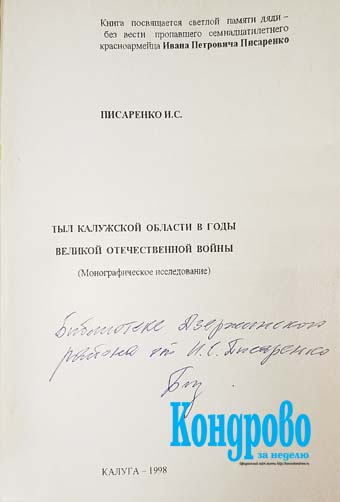 Познакомиться с монографией И.С.Писаренко «Тыл Калужской области в годы Великой Отечественной войны» вы можете в читальном зале Центральной районной библиотеки по адресу: г.Кондрово, ул.Комсомольская, д.2.