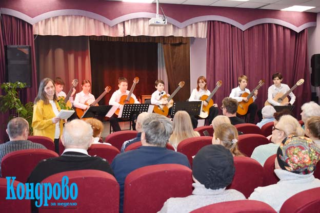Настоящий сюрприз всем собравшимся преподнесли воспитанники Кондровской детской школы искусств. В концертной программе со сцены звучала «живая» музыка. Первое произведение исполнил Иван Борков, второе – ансамбль гитаристов. Ребята подготовили эти номера под руководством своего преподавателя Е.В.Ларионовой, мамы Елизаветы. Зрители долго аплодировали юным артистам. Жаль, что концерт оказался таким коротким.